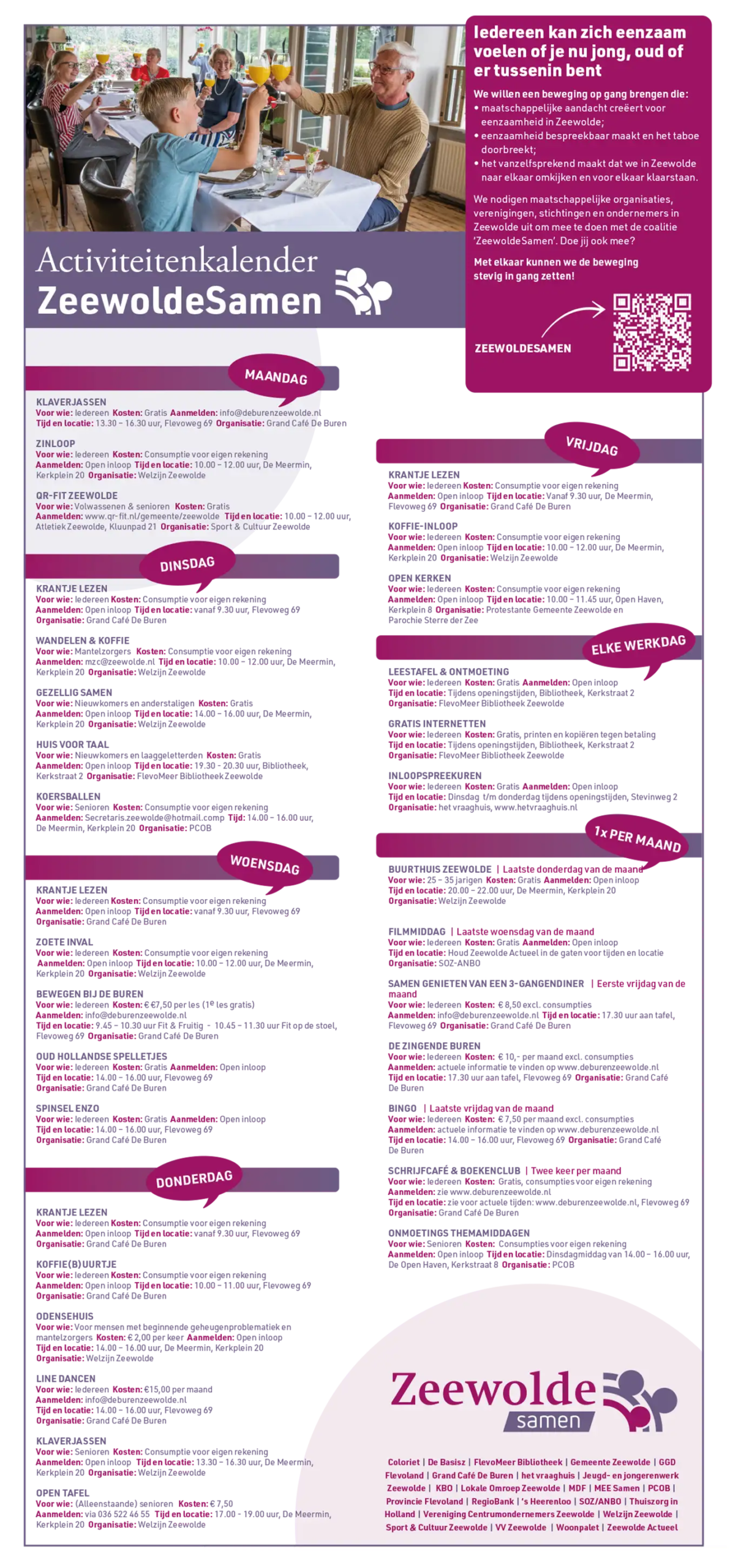Eenzaamheid kan iedereen overkomen. Bijvoorbeeld door ziekte, scheiding of verhuizing. In Zeewolde zijn er wekelijkse activiteiten, ontmoetingsplekken, organisaties en vrijwilligers die kunnen helpen om weer in contact te komen.